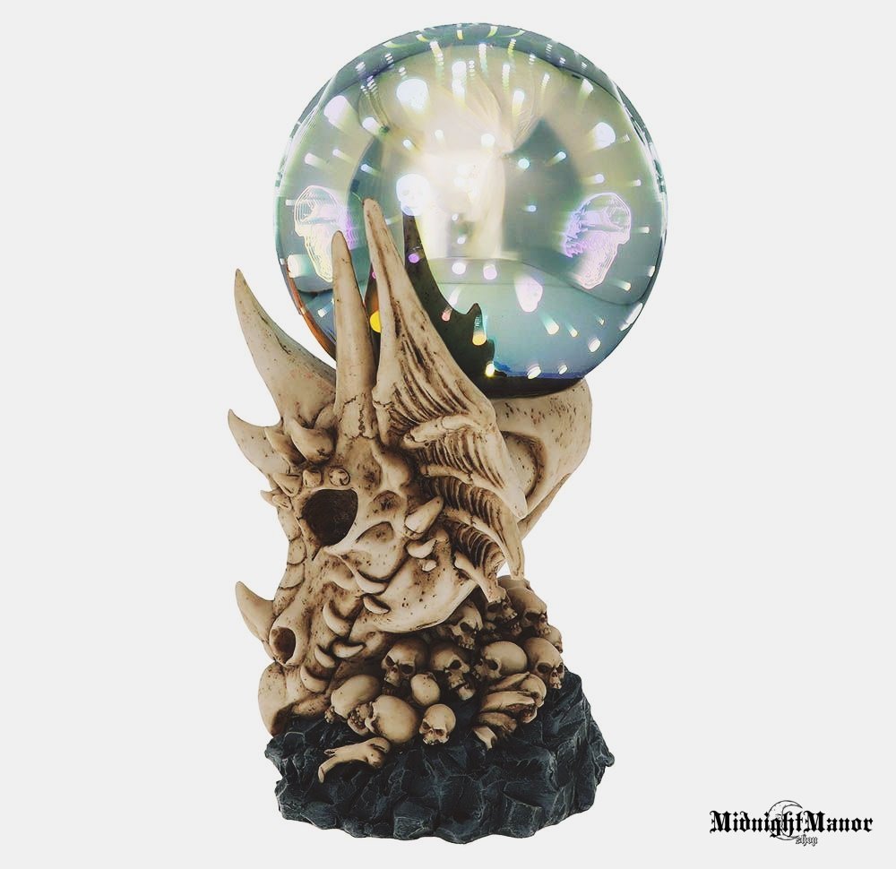 This Dragon skull becomes the plinth for this large silver orb. When switched on the ord shine multi-coloured skulls. Cast in the finest resin. Lovingly hand-painted.