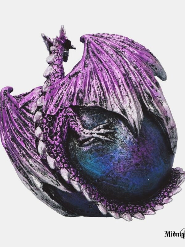 This beautiful wide-eyed creature rides away on the Ocean’s deep blue waves, off to an unfamiliar world. Featuring bright green scales with dark-blue accents on his claws, horns and wings. He cradles a silver metallic orb/pearl, delicate and pure. Cast in the finest resin and expertly hand painted, what is there not to love!